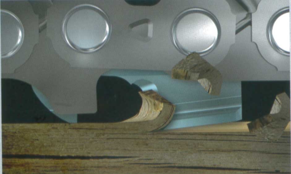 上刃の刃先が切り口の断面を削り、切りくずを持ち上げ、それと同時に横刃が切りくずを木材から切り離し、切りくずが取り除かれます。