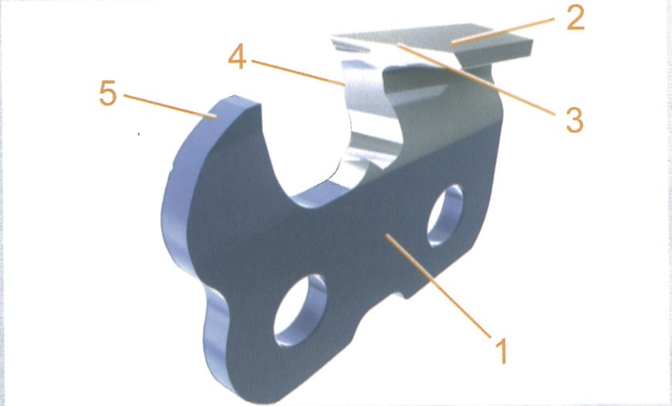 カッターはカッター本体(1)デプスゲージ(5)横刃の刃先(4)付きの上刃(2)および上刃の刃先(3)で構成されています。