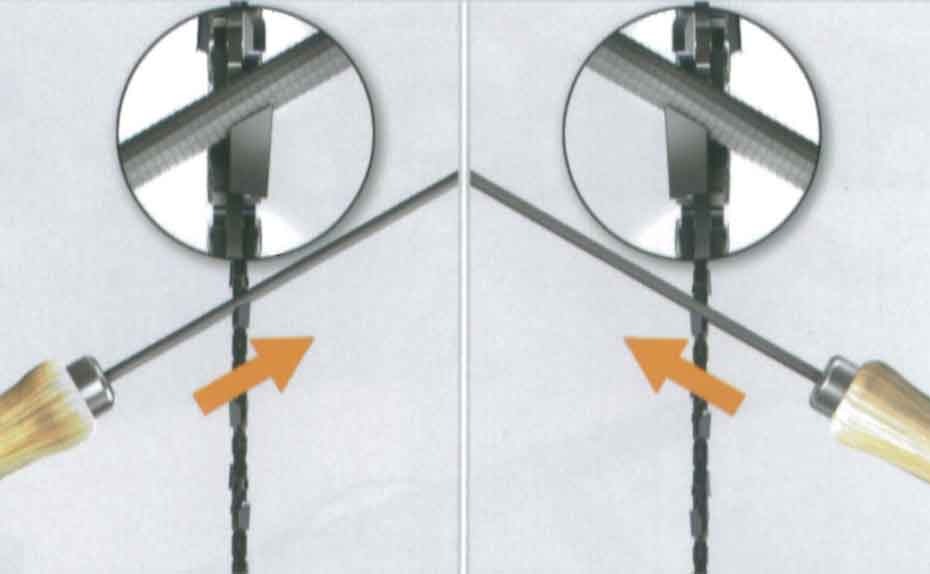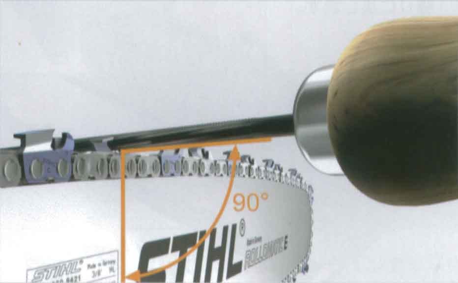 3. ヤスリは必ずガイドバーに対して直角90度に持ちます。ヤスリは前方に動かすときにのみ削ります。後方に動かすときはヤスリをカッターから離します。